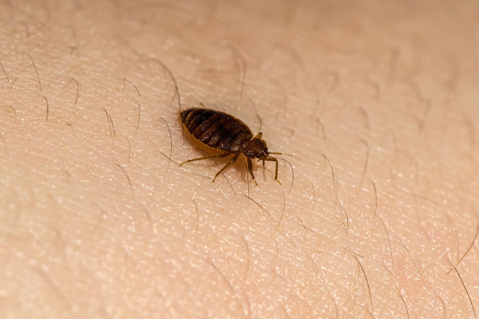 Punaise de lit adulte observée sur la peau humaine. Les punaises de lit sont des insectes nocturnes qui se nourrissent de sang et se cachent souvent dans les coutures du matelas.